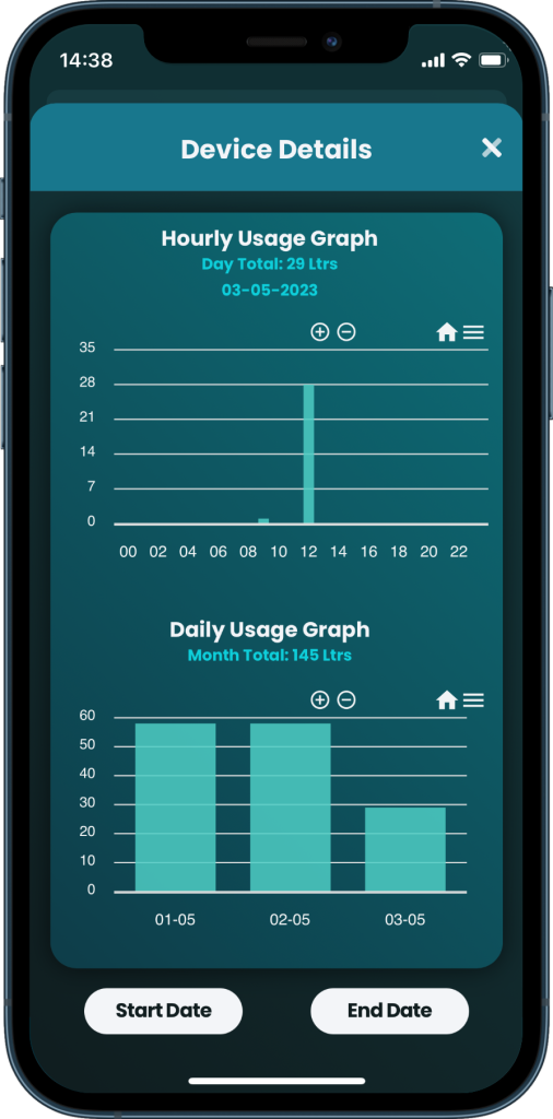By selecting the utility, and sliding the slider to the right, a graph icon will appear which when you click, you can view usage based on dates selected. The bottom graph will show the daily usage, the top graph will show by the hour.