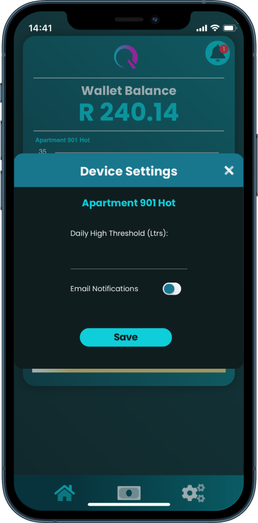 By selecting the utility, and sliding the slider to the left, a settings icon will appear which when you click, you will be able to set up alarms for high usage which will send a notification when the threshold is reached.