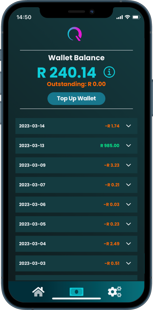 To add funds to your wallet, you can top up indicating the value you want to top up with by selecting either Ozow which is linked to your bank account to facilitate an instant EFT or Yoco which requires a VISA or MasterCard bank card. This will ensure the most timeous reflection of funds.