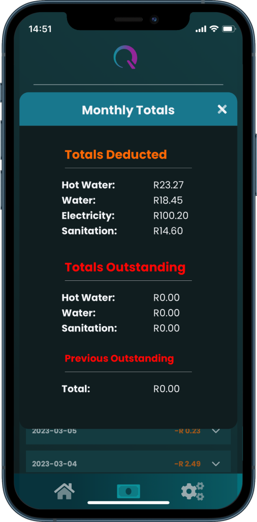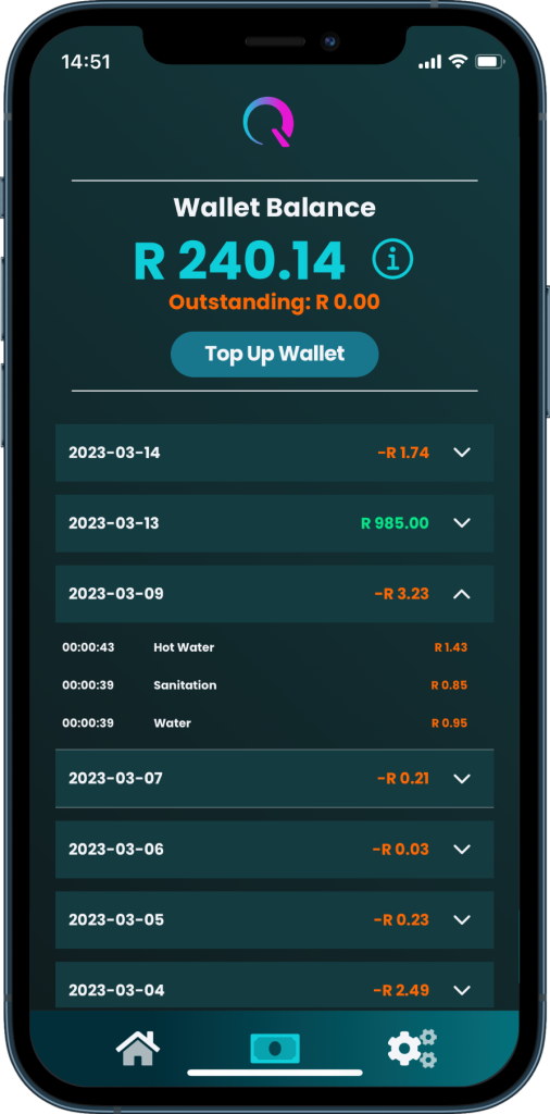 NetQ will show the money available in the wallet and the various entries for the different charges being billed. These are shown on the second page of the App. These charges are for electricity, water, sanitation, and energy. Each day has a drop-down page showing values for water, hot water, and sanitation.